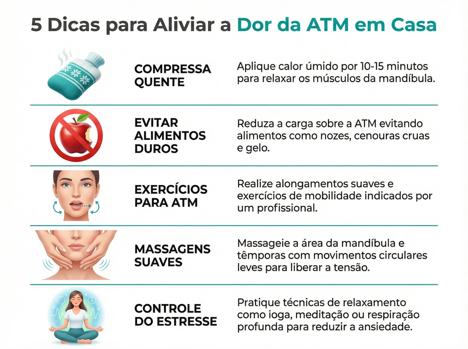 Se você está enfrentando dor na ATM, algumas medidas podem ajudar a aliviar os sintomas e melhorar a qualidade de vida. Aplicar uma compressa quente na região da ATM pode ajudar a relaxar os músculos bem como aliviar a dor, enquanto alternar com compressas frias pode reduzir a inflamação e o inchaço.