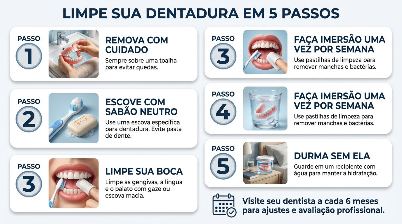 Infográfico com 5 passos para limpar prótese dentária para idosos: remover com cuidado, escovar com sabão neutro, higienizar a boca, usar pastilhas e dormir sem ela.