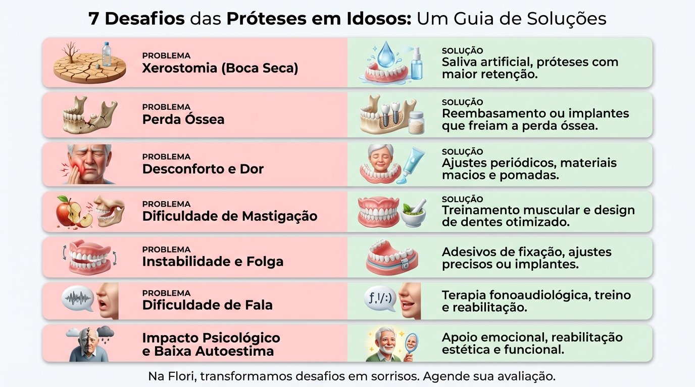 Infográfico listando os 7 desafios da prótese dentária em idosos e suas respectivas soluções modernas, como boca seca, perda óssea e limitações motoras.