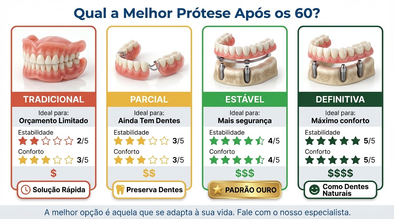 Guia visual que compara as 4 principais opções de prótese para a terceira idade