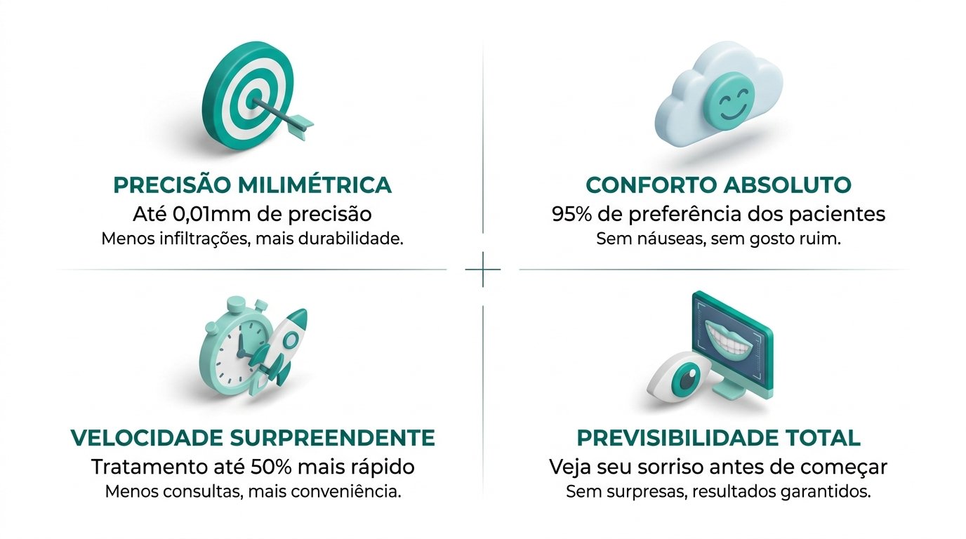 - Comunicação Instantânea: O arquivo digital é enviado ao laboratório em segundos, eliminando o tempo de transporte do molde físico.