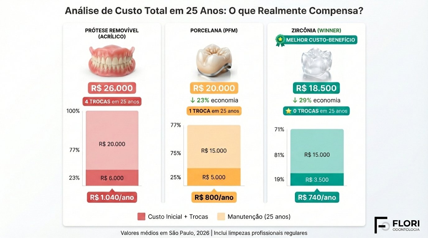 Vamos analisar um cenário real de um paciente que precisa substituir um dente. Consideraremos três opções: uma prótese removível parcial, uma coroa de porcelana e uma coroa de zircônia. Para simplificar, vamos usar valores médios do mercado em São Paulo em 2026.