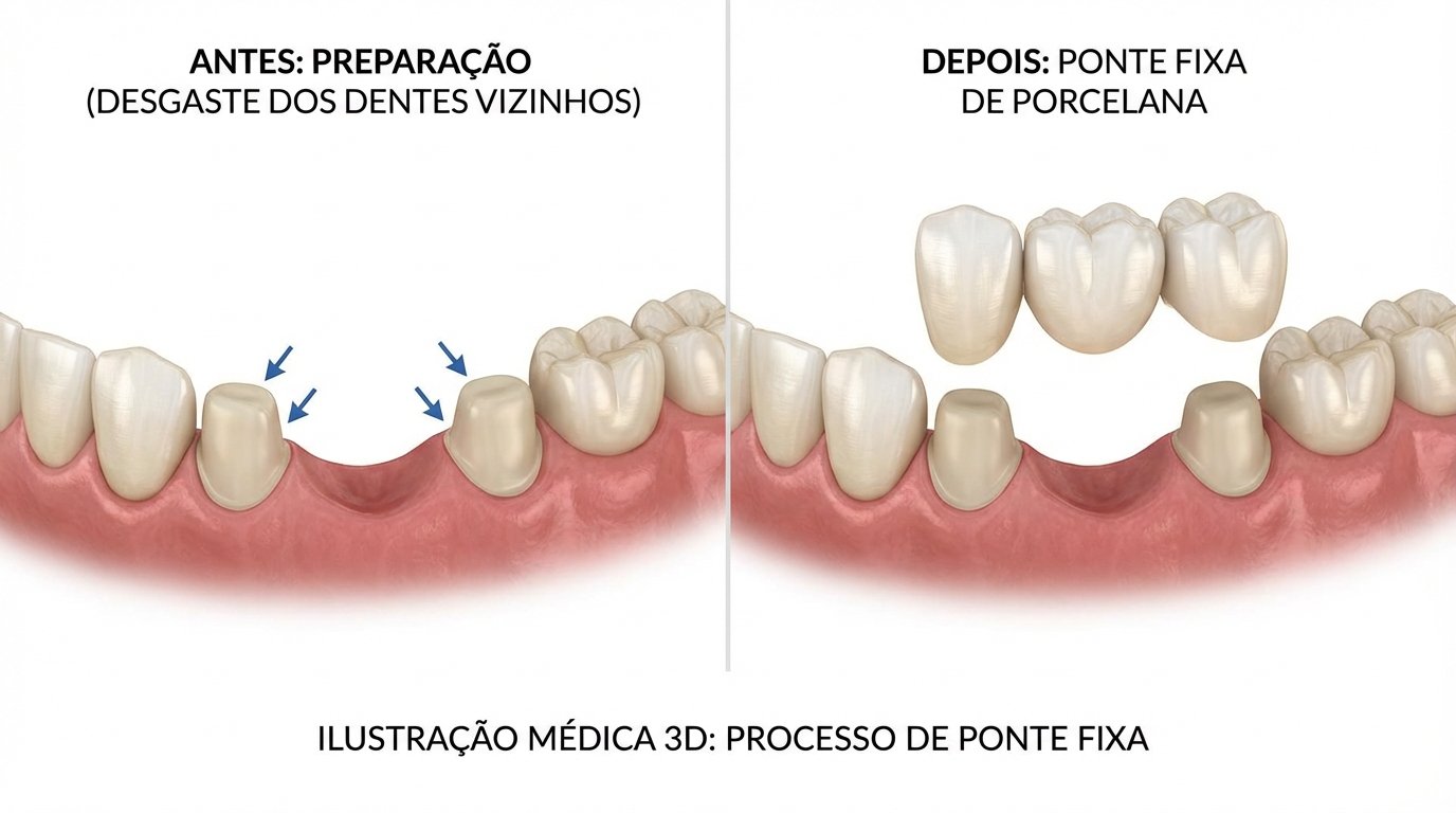 - Ponte Fixa (ou Prótese Parcial Fixa): Usada para substituir um ou mais dentes perdidos. Ela funciona como uma “ponte”, onde os dentes vizinhos ao espaço vazio (chamados de pilares) são desgastados para servirem de apoio para a estrutura que contém os dentes artificiais (pônticos).