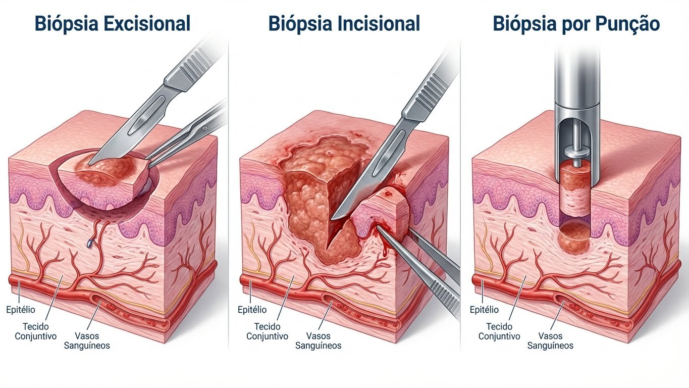 Importante: A biópsia não é um tratamento – é um exame. No entanto, em alguns casos (biópsia excisional), a remoção da lesão para análise também resolve o problema, funcionando como diagnóstico e tratamento simultâneos.