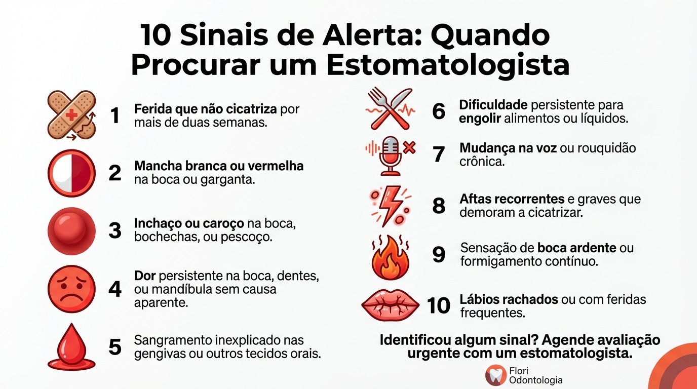 Infográfico com 10 sinais de alerta que indicam necessidade de consulta com estomatologista, incluindo feridas que não cicatrizam e manchas na boca