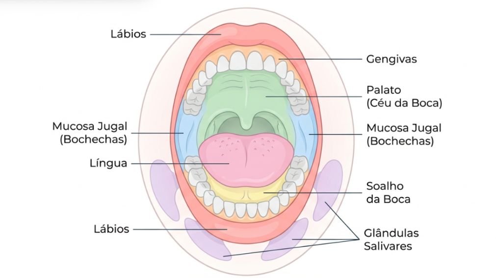 Infográfico mostrando as áreas da boca tratadas pelo estomatologista: lábios, língua, mucosas, gengivas e glândulas salivares