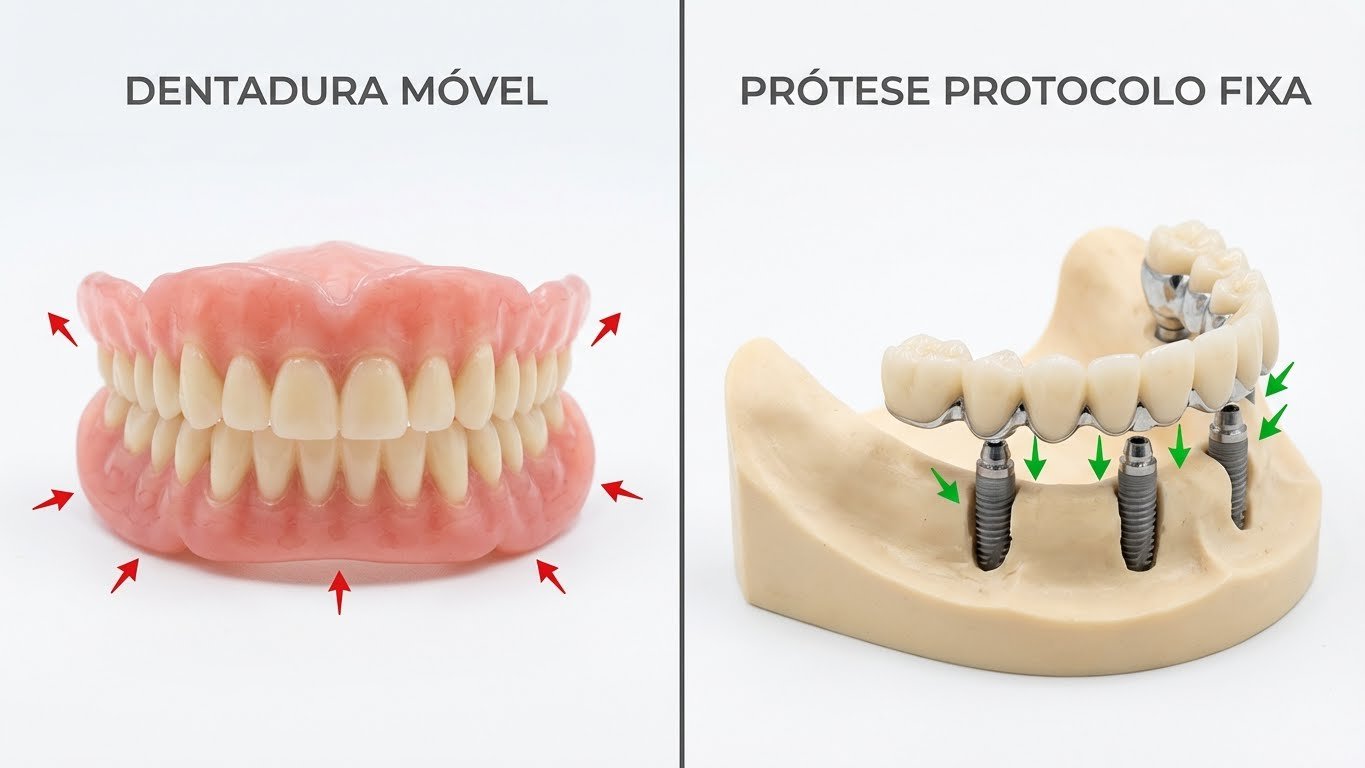 Ao contrário da dentadura convencional (móvel), a prótese protocolo não se apoia na gengiva, mas sim diretamente nos implantes integrados ao osso. Isso elimina completamente os problemas de instabilidade, desconforto e perda de paladar associados às dentaduras.