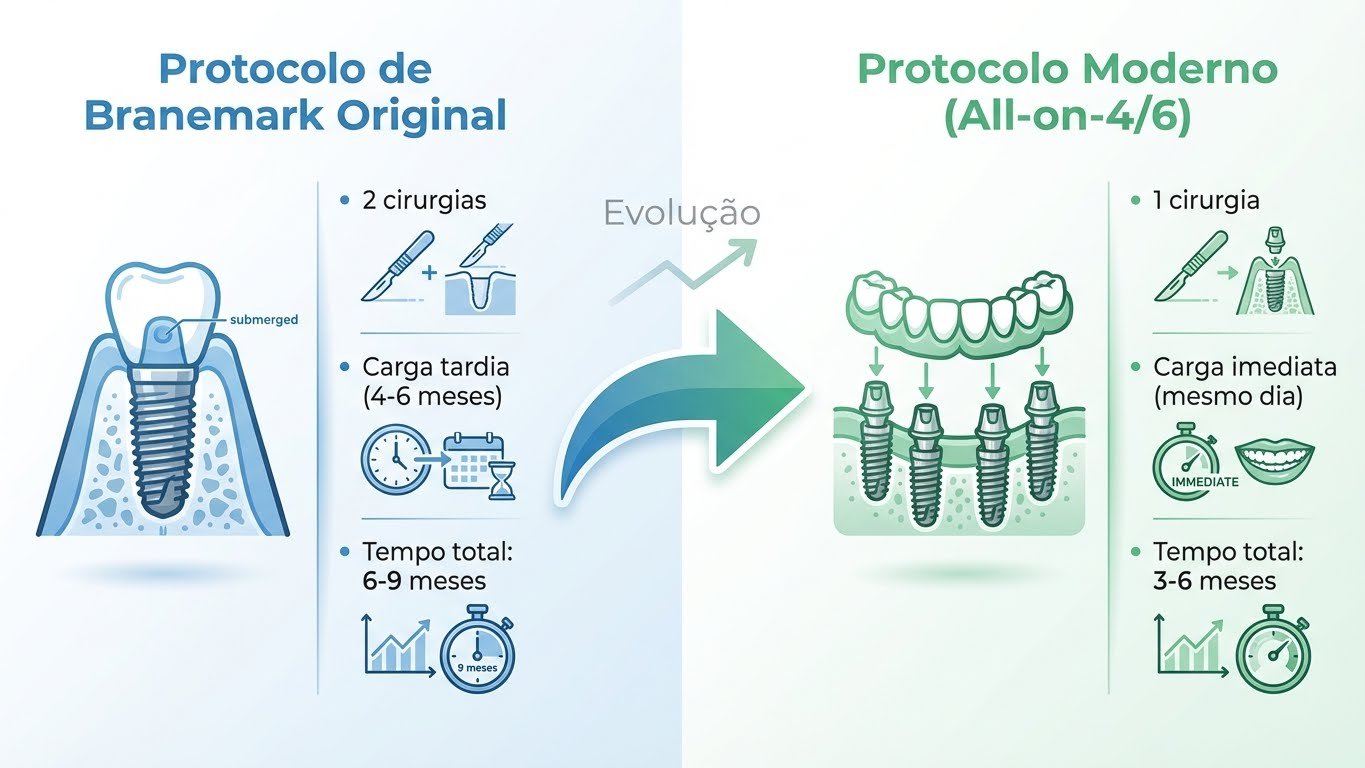 Hoje, as técnicas evoluíram drasticamente. As soluções modernas, como o All-on-4 e o All-on-6, são evoluções diretas do conceito de Branemark, mas com uma vantagem revolucionária: a carga imediata.