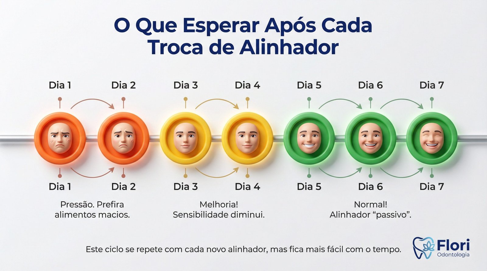 Existe um período de adaptação com uma sensação de pressão leve a moderada nas primeiras 48h de cada novo alinhador. A ausência total de sensação indicaria falta de força para mover os dentes.
