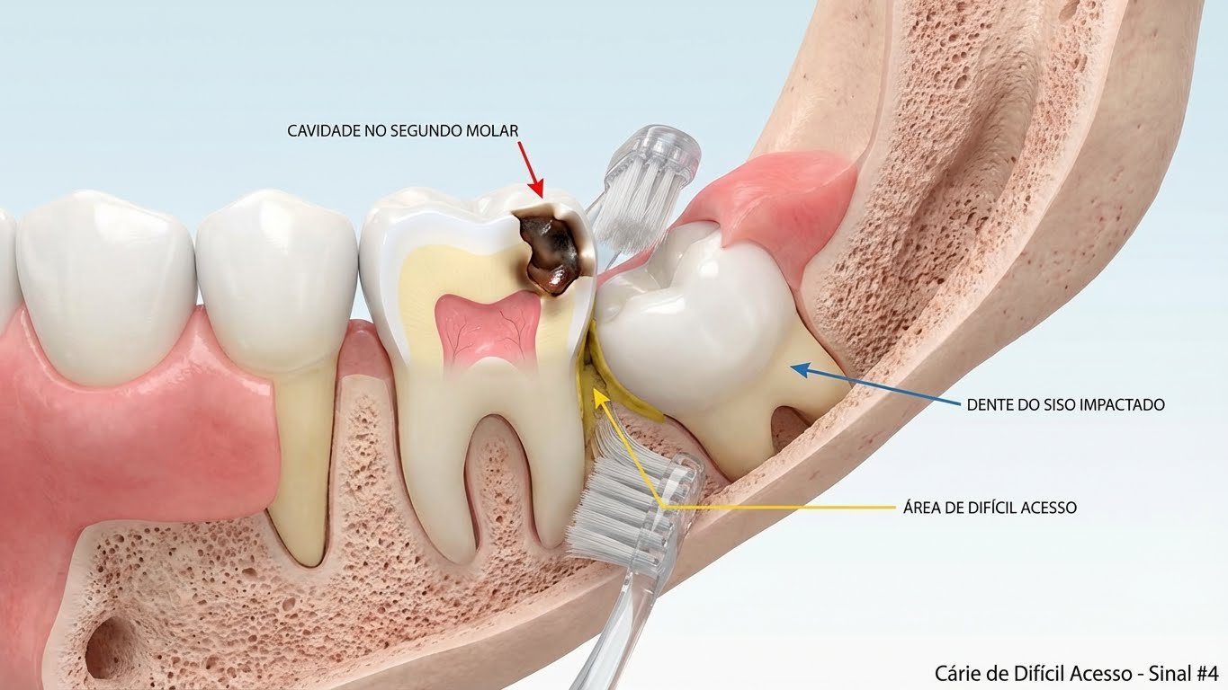 - Difícil acesso para escovação: A escova de dentes não alcança adequadamente a superfície dos sisos
