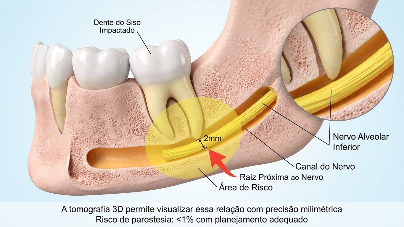 - Tecnologia de Imagem: Utilizamos radiografias panorâmicas e, em casos de proximidade com nervos, tomografia computadorizada de feixe cônico (Cone Beam), que fornece uma visão 3D precisa da anatomia do paciente, permitindo um planejamento cirúrgico que evita lesões em estruturas nobres.