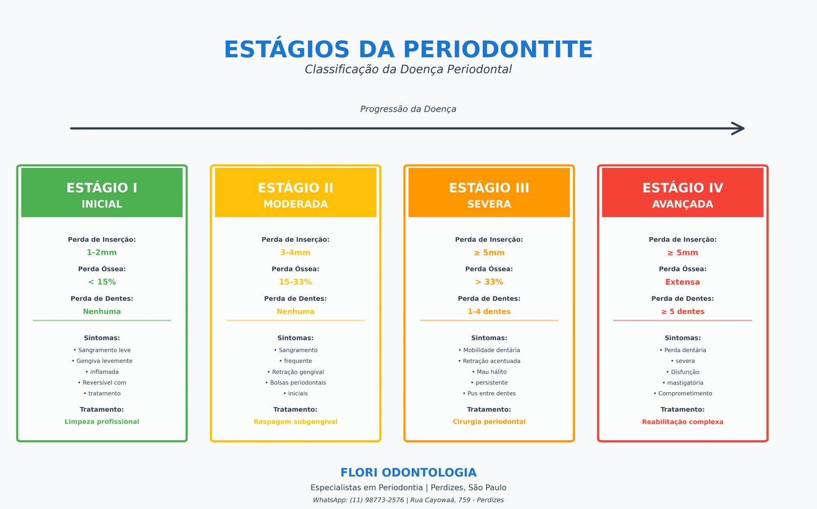A periodontite é classificada em estágios, de acordo com a sua severidade. A classificação de 2018, a mais atual, define quatro estágios: