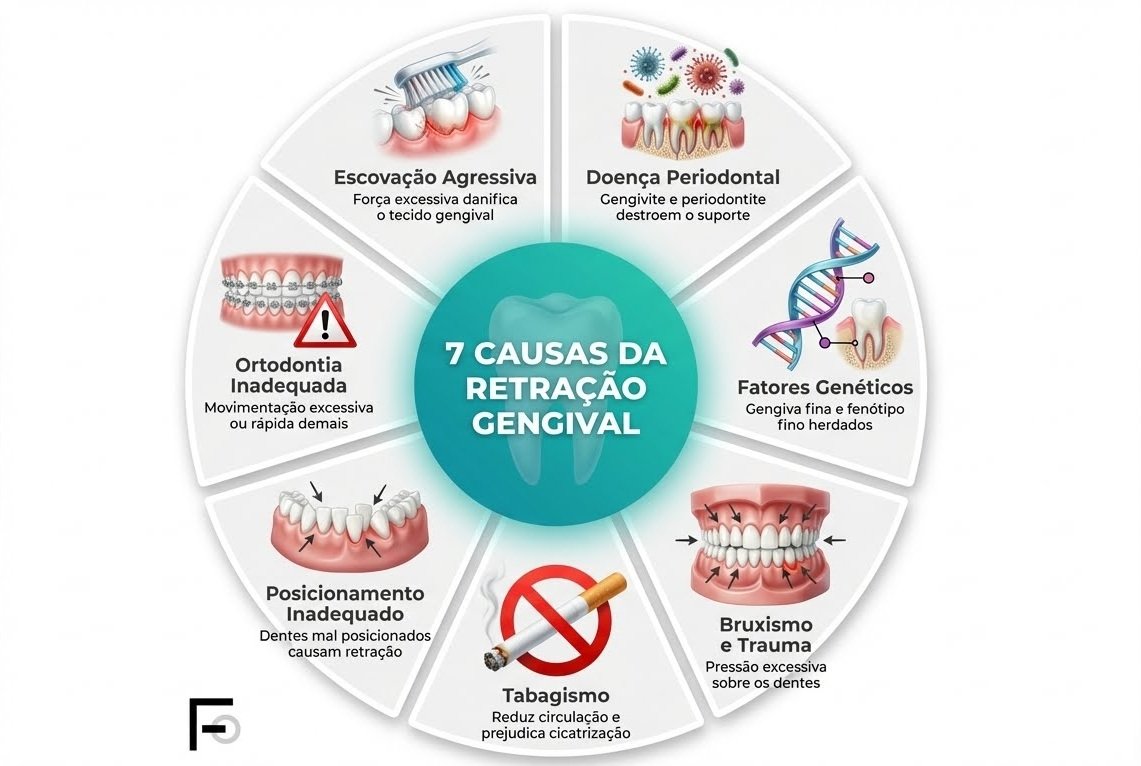 A retração gengival é multifatorial, o que significa que diversas causas podem estar envolvidas, agindo de forma isolada ou em conjunto. Identificar o fator causal é crucial para o sucesso do tratamento.