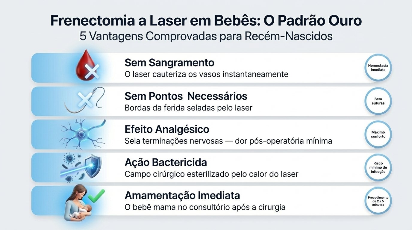 Hoje, a tecnologia revolucionou esse cenário. A de alta potência (como o laser de Diodo ou Er:YAG) é considerada o padrão-ouro para o tratamento de bebês, oferecendo vantagens clínicas e biológicas incomparáveis .