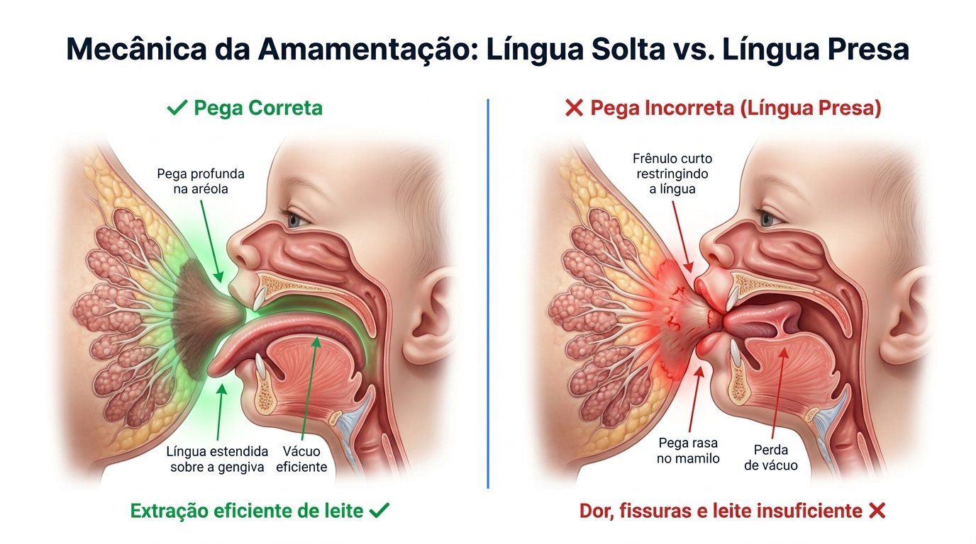 Quando o bebê apresenta anquiloglossia, a restrição de movimento impede que a língua realize essa extensão e elevação adequadas. Sem conseguir formar o selamento (vácuo) necessário ao redor da aréola, a mecânica da amamentação é totalmente desestabilizada.