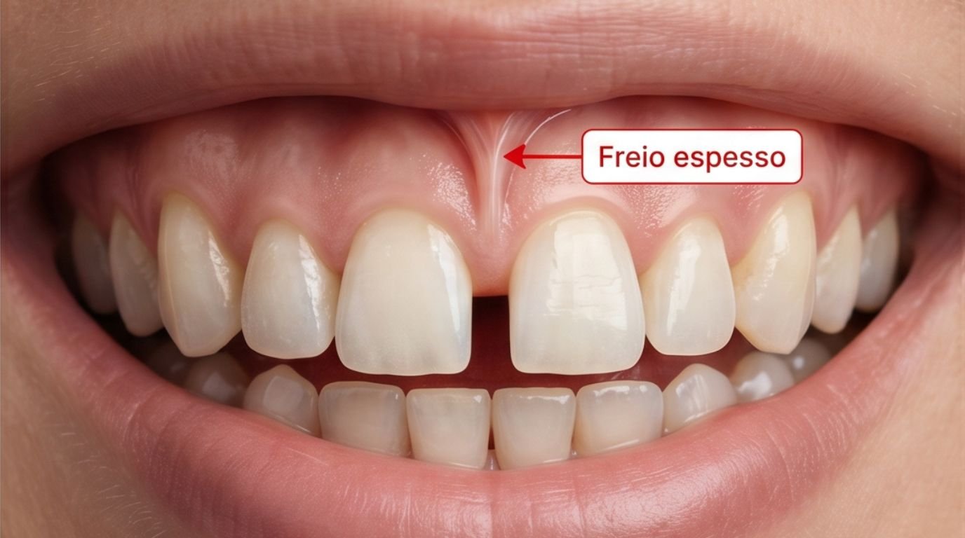 Quando o freio se insere muito próximo ou até mesmo entre os dentes centrais, as fibras musculares exercem uma força de tração contínua. Essa força não apenas empurra os dentes para os lados, criando o espaço, mas também impede que eles se juntem naturalmente .