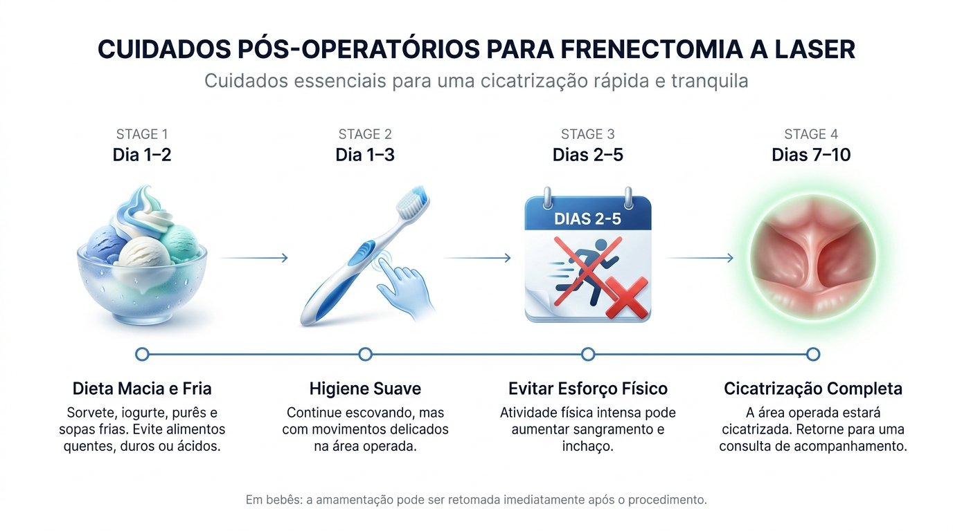 A recuperação da frenectomia a laser é notavelmente tranquila. Em média, o tecido cicatriza completamente entre 7 e 14 dias, mas o paciente pode retornar à sua rotina normal quase imediatamente.