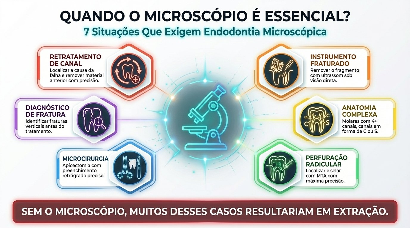 Embora o microscópio melhore os resultados em qualquer tratamento de canal, existem situações em que ele é absolutamente necessário: